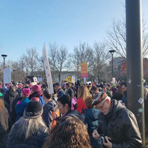 The women (and many men too) marched to support a variety of issues that affect women and to support equality for all people. The primary focus was on issues of sexism, racism, xenophobia, gender equality, and other forms of oppression. There was also some protesting the new president. Many women wore pink knitted “pussy hats,” as a sign of protest against our president who likes to grab women by the pussy.